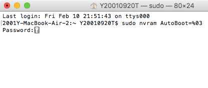 AutoBoot=再開するには以下のコードを実行してパスワードを入力します。 sudo nvram AutoBoot=%03終わったら最後に再起動しましょう。 参考